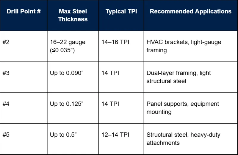 Each drill-point number corresponds to a steel gauge range. Using the wrong tip can cause screw stall-out, thread shearing, or incomplete fastening. Contractors should always verify point type against the metal being joined. As detailed in the Fastener Systems blog, Tek 3 screws are optimal for thinner steel, while Tek 5 screws support heavier gauge assemblies without pilot holes.